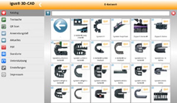 Using the mobile igus® 3D-CAD app, engineers can search the igus® product catalog for components and configure these. Receive native file formats for further processing at your workstation.