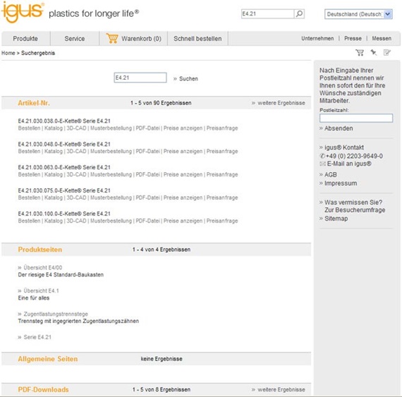 With the newly enhanced search function, keywords, product names, part numbers or part number components can be searched across the entire site. The results page lists the found entries according to part number hits, product pages, general pages or downloads.