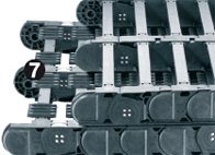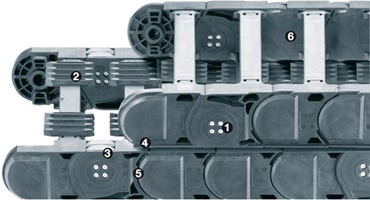 The low maintenance igus® P4 system allows a reliable energy supply system to be implemented on long distances up to 800 m for crane equipment or conveyor systems. The top and bottom run roll offset from one another. This means that nothing rolls over the tribo-optimized plastic rollers, but instead they roll on a continuous, wide rolling surface. The comb-like AUTO-GLIDE crossbars and the special trough system reliably guides the P4 e-chain®. Ideal for applications with high travel speeds (up to 10 m/s) and large fill weights (up to 30 kg/m)