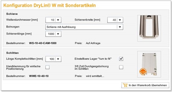 There is a choice between different shaft diameters and rail widths (weight-reduced, milled rail option can be selected) and a selection of the required drilling pattern. You can specify the individual length of the rail, and the price is automatically calculated. The appropriate carriage is pre-selected for the rail; the length of the carriage can be adjusted. In addition the options "adjustable bearing" or "hand clamp" can also be selected. Rail and carriage can be directly transferred to the shopping cart with the price. If necessary, the required number can also be adjusted there.
